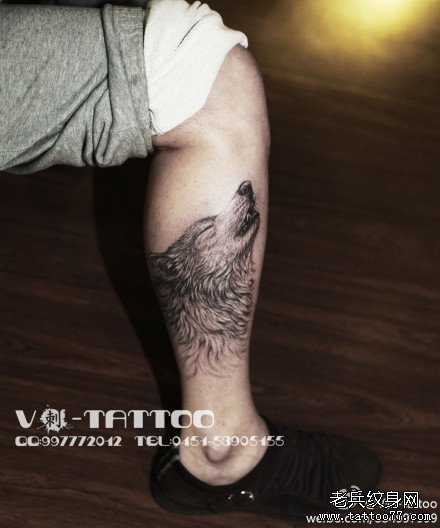 男人腿部经典帅气的一款黑灰狼头纹身图案