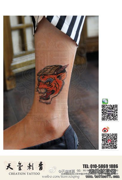 女生腿部一款潮流经典的school风格的虎头纹身图案