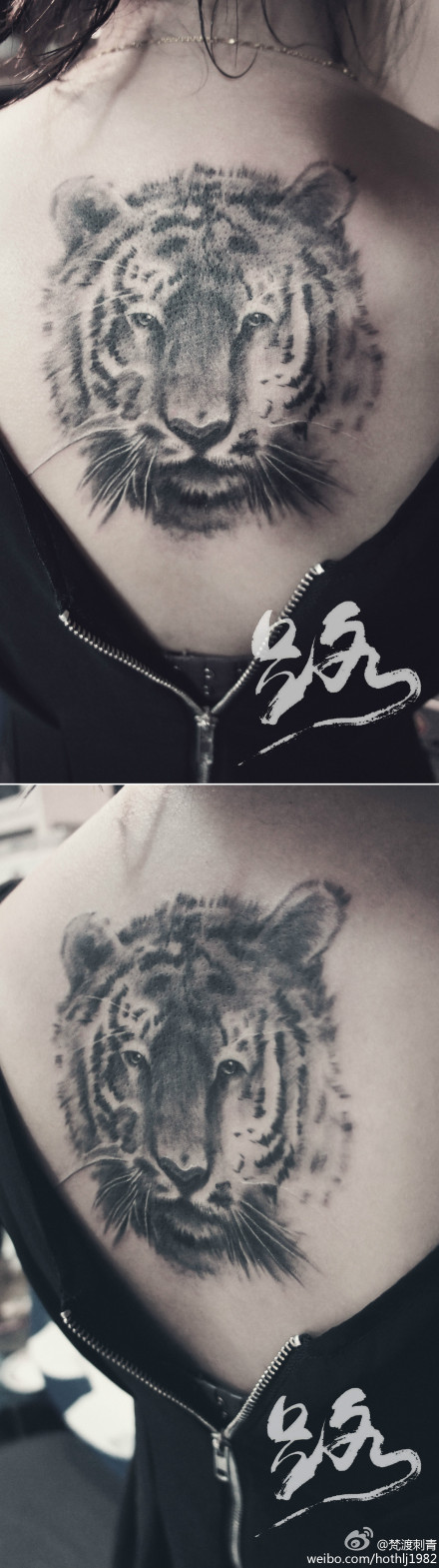 女生后背呆呆的一款虎头纹身图案