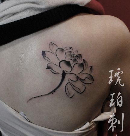 女孩子肩背流行时尚的水墨画莲花纹身图案