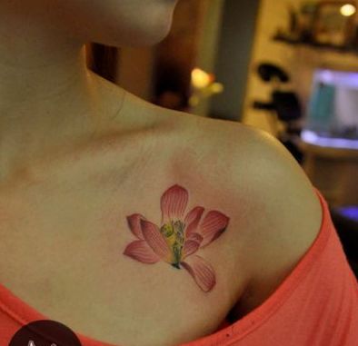女孩子肩膀处一款好看的彩色莲花纹身图案