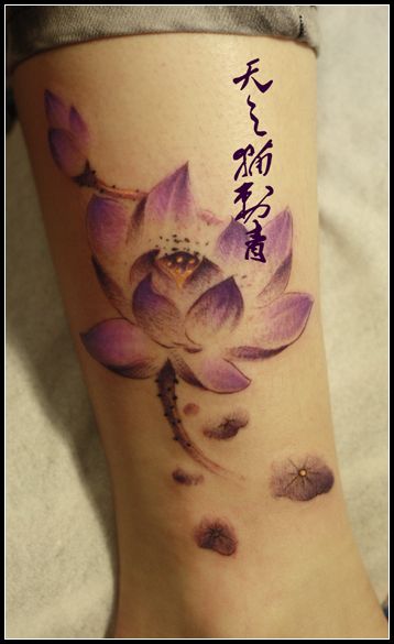 腿部漂亮的水墨彩色莲花纹身图案
