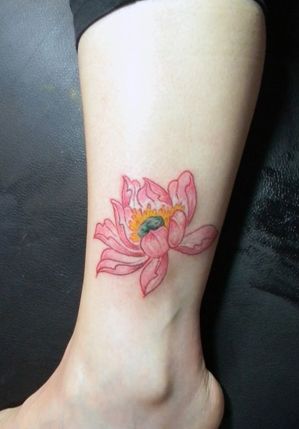 美女腿部漂亮的彩色莲花纹身图案