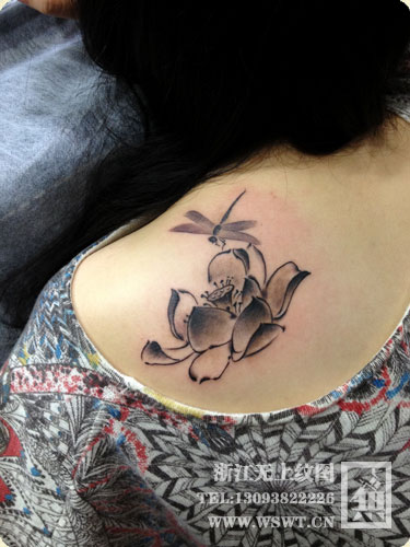 美女肩背唯美好看的水墨莲花纹身图案