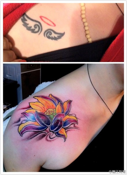 女生肩膀处唯美时尚的莲花纹身图案