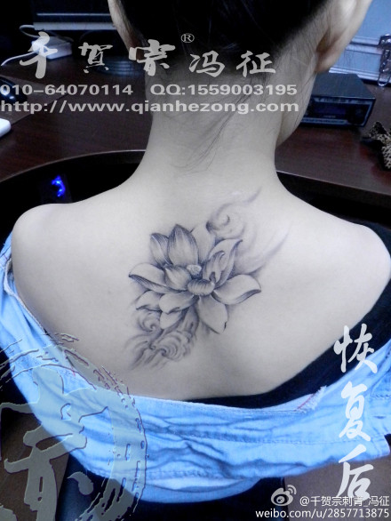 女生背部唯美时尚的黑白莲花纹身图案