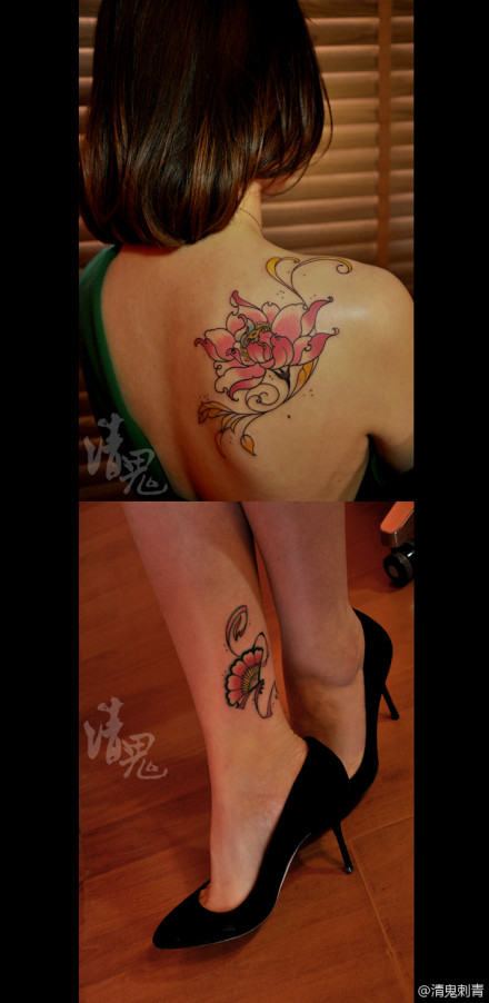 美女肩膀好看的彩色莲花与腿部小扇子纹身图案