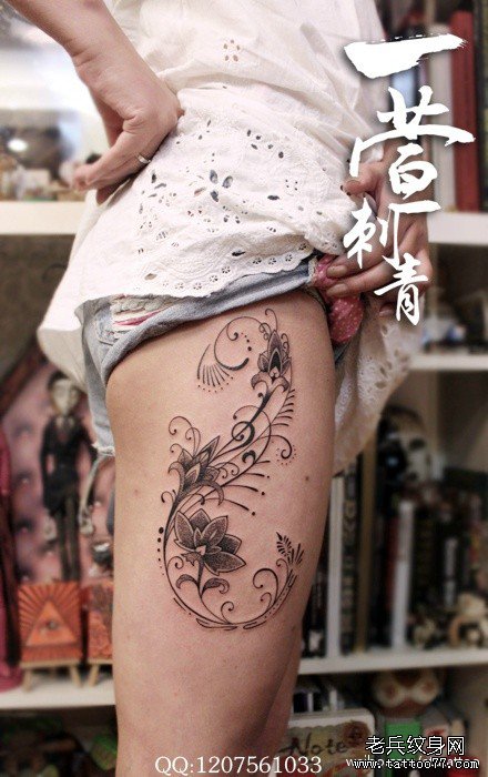 美女腿部潮流精美的图腾莲花藤蔓纹身图案