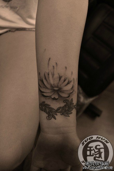 美女手腕小巧的黑灰莲花纹身图案