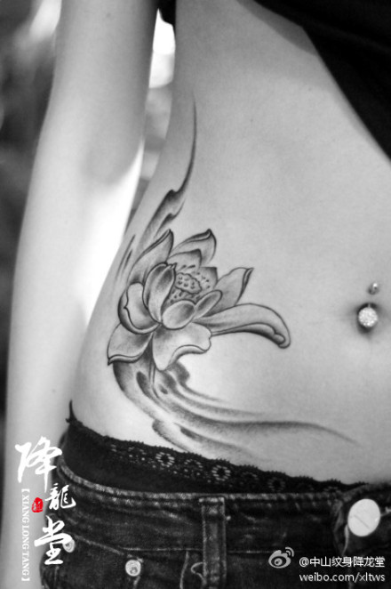 美女腹部唯美潮流的黑灰莲花纹身图案