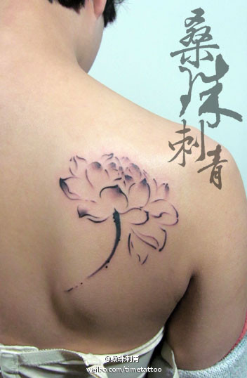 肩背唯美时尚的黑灰写意莲花纹身图案