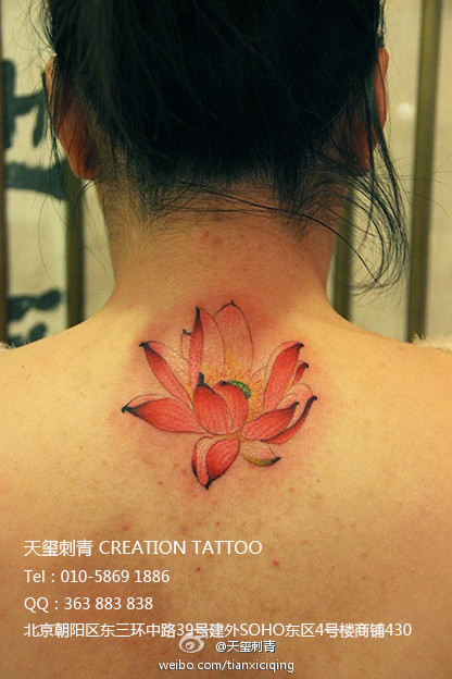女生后颈部唯美潮流的粉色莲花纹身图案