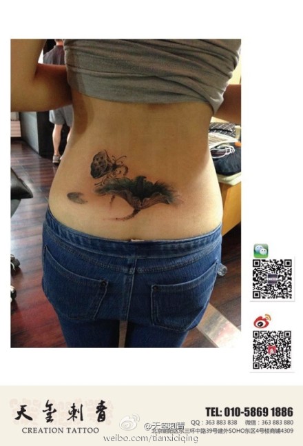 美女后腰唯美写意的莲蓬荷叶纹身图案