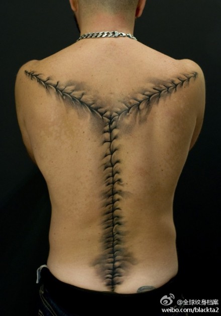 男人背部时尚另类的撕皮纹身图案