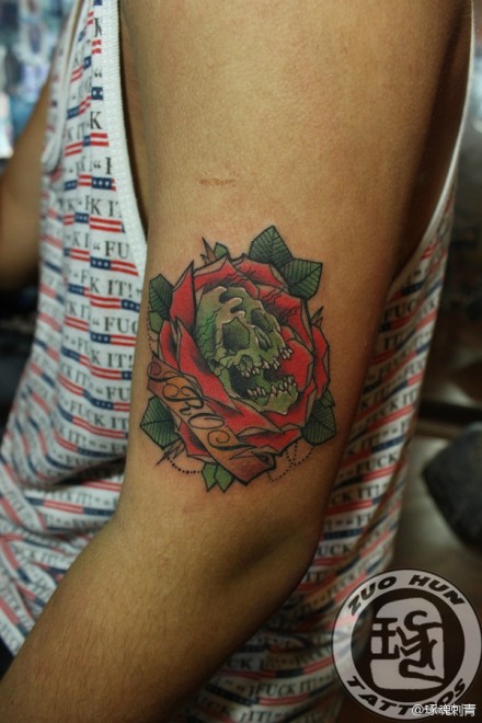 手臂经典另类的玫瑰与骷髅纹身图案