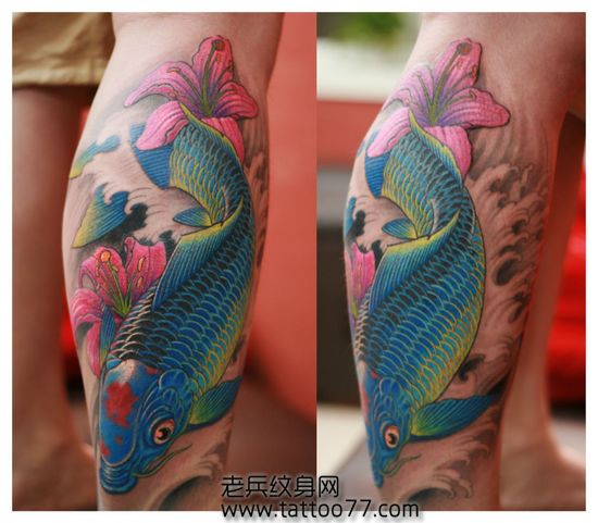 腿部彩色鲤鱼百合花纹身图案