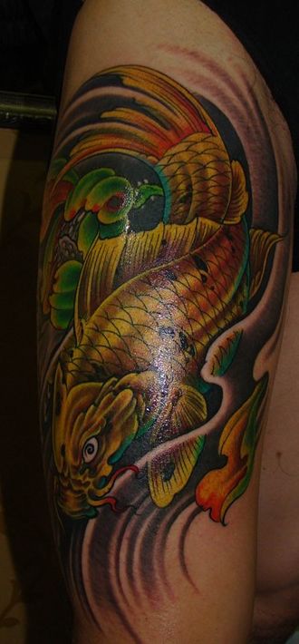 腿部精美好看的彩色鲤鱼纹身图案