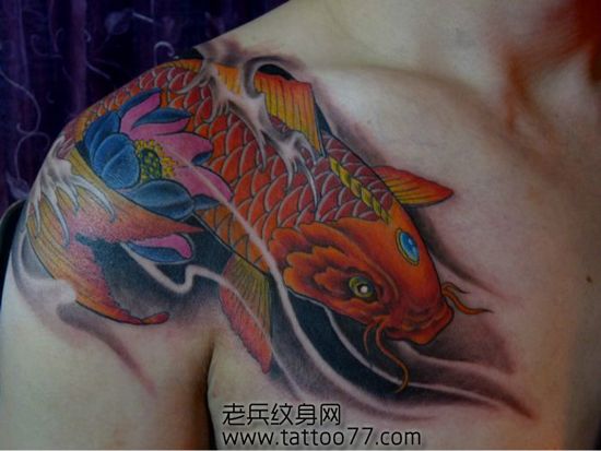 男人肩膀处漂亮的彩色鲤鱼纹身图案