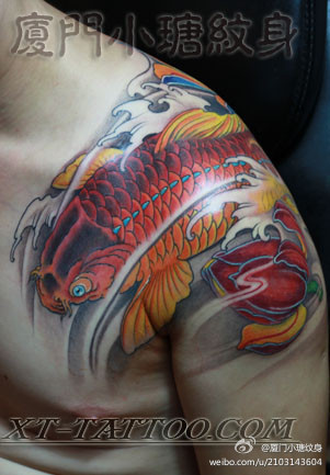男人肩膀处漂亮的彩色过肩鲤鱼纹身图案