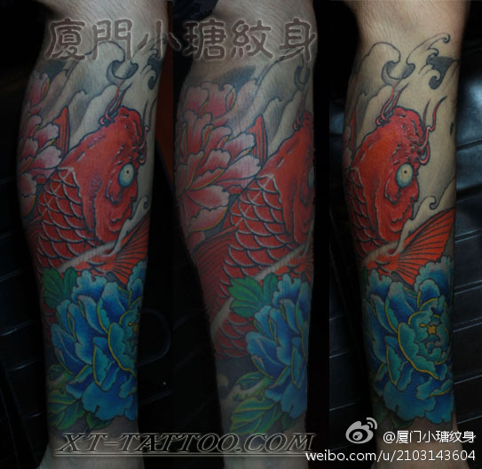 男人腿部唯美的传统鲤鱼牡丹纹身图案