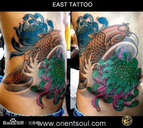 男人腰部经典流行的鲤鱼菊花纹身图案
