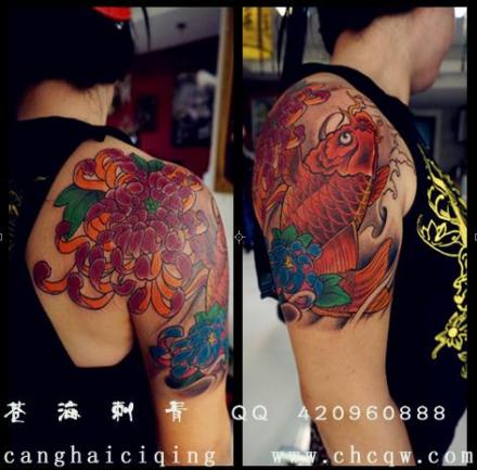 女生手臂到肩膀漂亮的鲤鱼与菊花纹身图案
