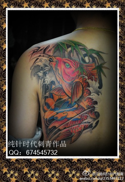 男人后肩背漂亮时尚的彩色鲤鱼纹身图案