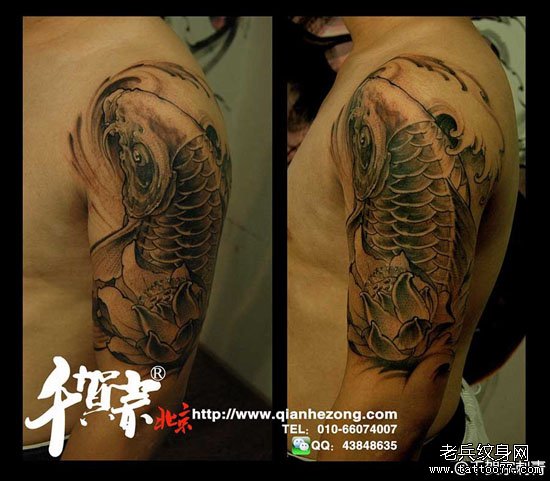 手臂时尚潮流的一款黑灰鲤鱼纹身图案