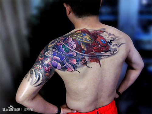 男人肩背唯美时尚的彩色鲤鱼莲花纹身图案