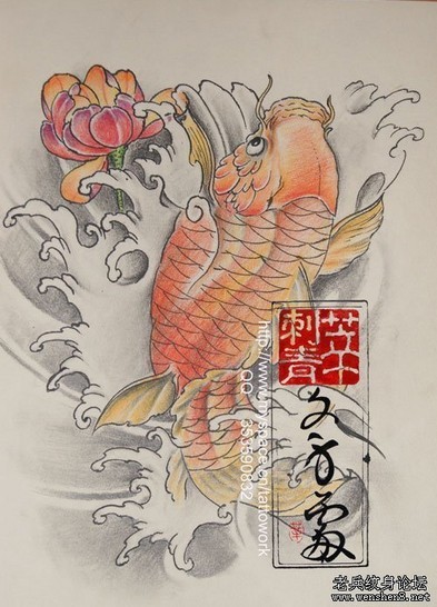 武汉专业纹身店为你提供一款彩色鲤鱼莲花纹身图案纹身图片