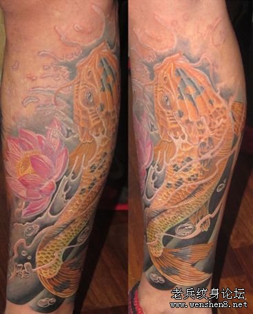 腿部3D彩色鲤鱼莲花纹身图案大全