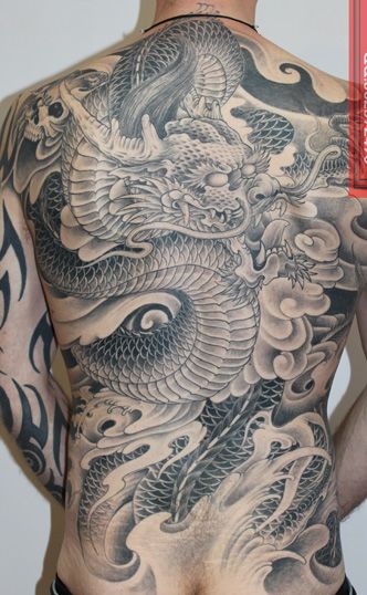 满背黑灰龙纹身图案