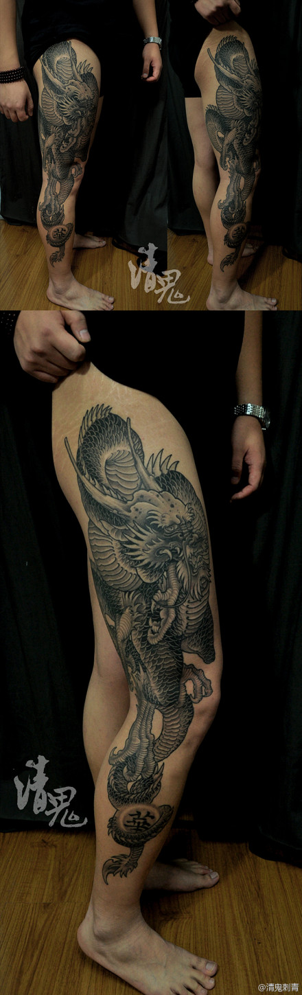 男人腿部超酷的黑白传统龙纹身图案