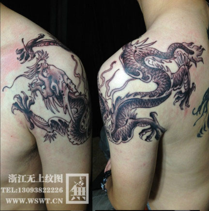 男人肩膀处潮流经典的黑灰龙纹身图案