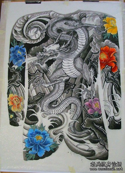 龙纹身图案大全:超酷超赞的满背龙牡丹纹身图案纹身图片