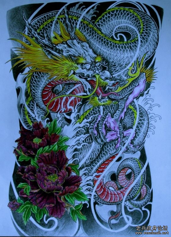龙纹身图案大全:超酷超赞的满背龙牡丹纹身图案纹身图片