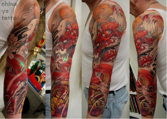 一款华丽的彩色花臂龙莲花纹身图案纹身图片