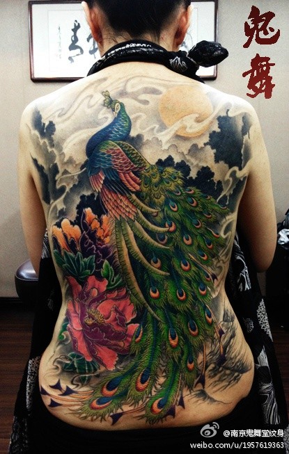 超帅精美的美女满背孔雀纹身图案