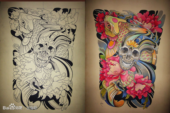 超帅很酷的满背骷髅鲤鱼纹身图案