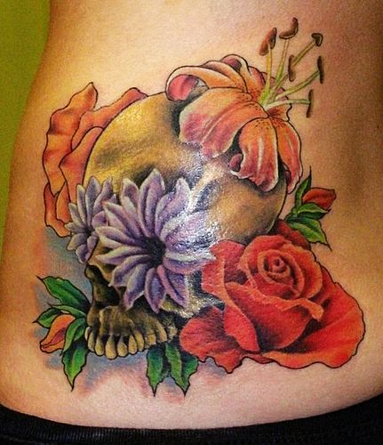 武汉仙桃文身店:腰部彩色骷髅百合玫瑰纹身图案