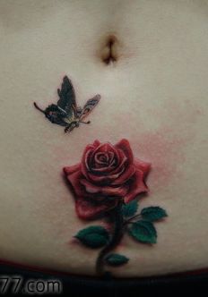 美女腹部彩色玫瑰花蝴蝶纹身图案