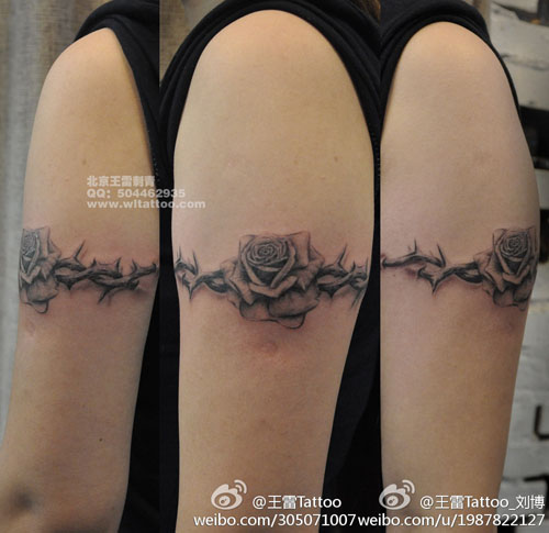 男生手臂好看经典的玫瑰花与荆条纹身图案
