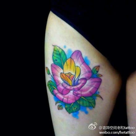 腿部漂亮的彩色new school玫瑰花纹身图案
