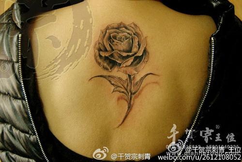女生后背唯美清晰的黑灰玫瑰花纹身图案