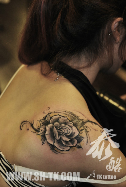 女生肩膀处漂亮时尚的黑灰玫瑰花纹身图案
