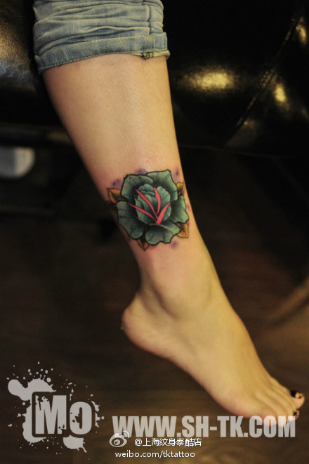 女生腿部艳丽潮流的玫瑰花纹身图案