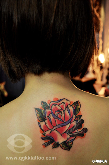 女生后背漂亮的欧美风格彩色玫瑰花纹身图案