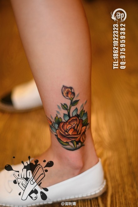 美女大腿处唯美潮流的彩色玫瑰花纹身图案