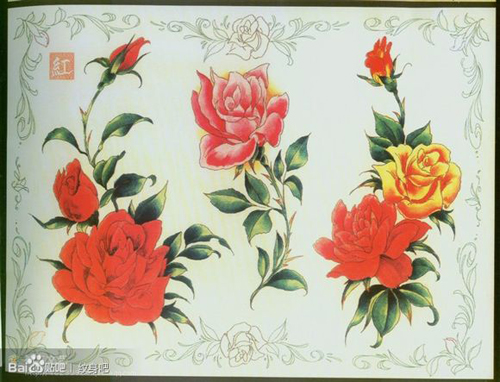 潮流时尚的的一组彩色玫瑰花纹身手稿