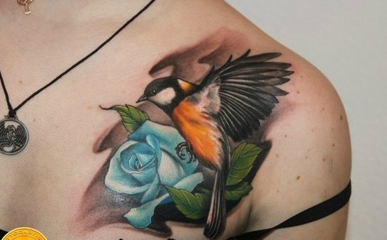 女生肩膀处潮流时尚的小鸟与玫瑰花图案